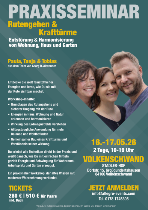 Du erlebst alle Techniken direkt in der Praxis und weißt danach, wie Du mit einfachen Mitteln gezielt Energie und Schwingung für Wohnraum, Arbeitsplatz und Garten erzeugst.