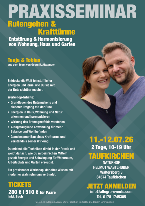 Du erlebst alle Techniken direkt in der Praxis und weißt danach, wie Du mit einfachen Mitteln gezielt Energie und Schwingung für Wohnraum, Arbeitsplatz und Garten erzeugst.