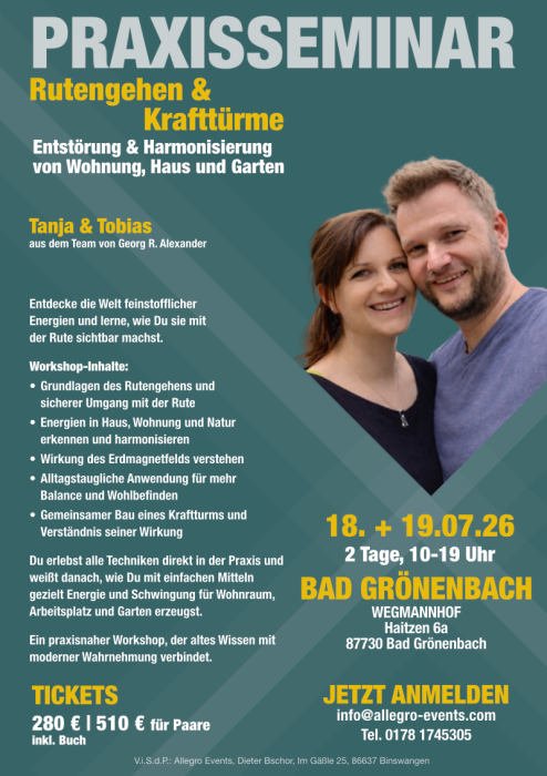 Du erlebst alle Techniken direkt in der Praxis und weißt danach, wie Du mit einfachen Mitteln gezielt Energie und Schwingung für Wohnraum, Arbeitsplatz und Garten erzeugst.